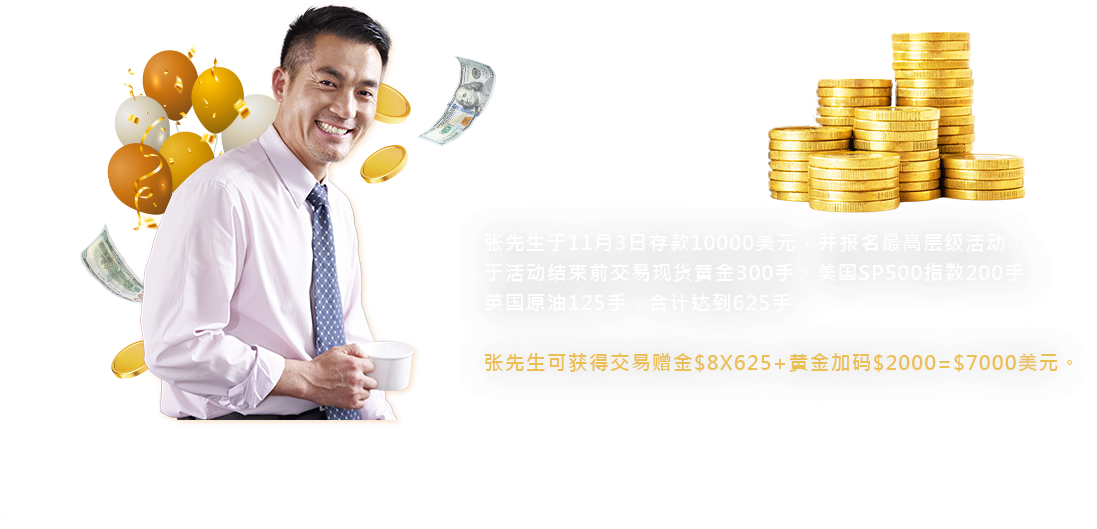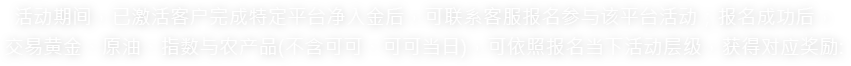 活动期间,已激活客户完成特定平台净入金后,可联系客服报名参与该平台活动;报名成功后,交易黄金、原油、指数与农产品(不含可可、可可(当日)),可依照报名当下活动层级,获得对应奖励: