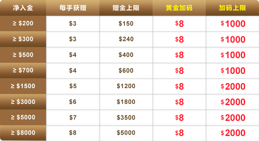 | 净入金 | 每手返赠 | 赠金上限 | 黄金加码 | 加码上限 |